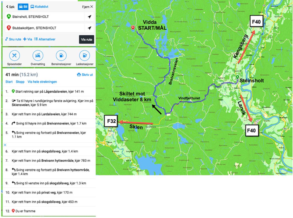 Benyttes egen bil må det påregnes ca. 50 min fra Borgen Skiarena til startstedet (Viddaseter), samt betaling av bomavgift (kr 90,-)